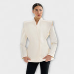 Sochařská bunda Valerija na ramena je moderní oděv, který kombinuje čisté linie a architektonickou dramatičnost. Je ideální pro galerie, módní večeře nebo pro vytvoření dojmu v pracovním prostředí.