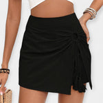Elegantní a ženské, tyto šortky-sukně s vysokým pasem a diskrétním zavázáním vpředu zvýrazňují siluetu s dokonalou elegancí. Ideální pro letní kombinace, spojují pohodlí a styl při jakékoli příležitosti.