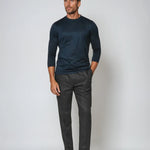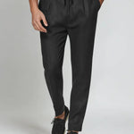 Elegantní černé lněné kalhoty s pohodlným pasem, které se snadno hodí jak k volným, tak k formálním outfitům.