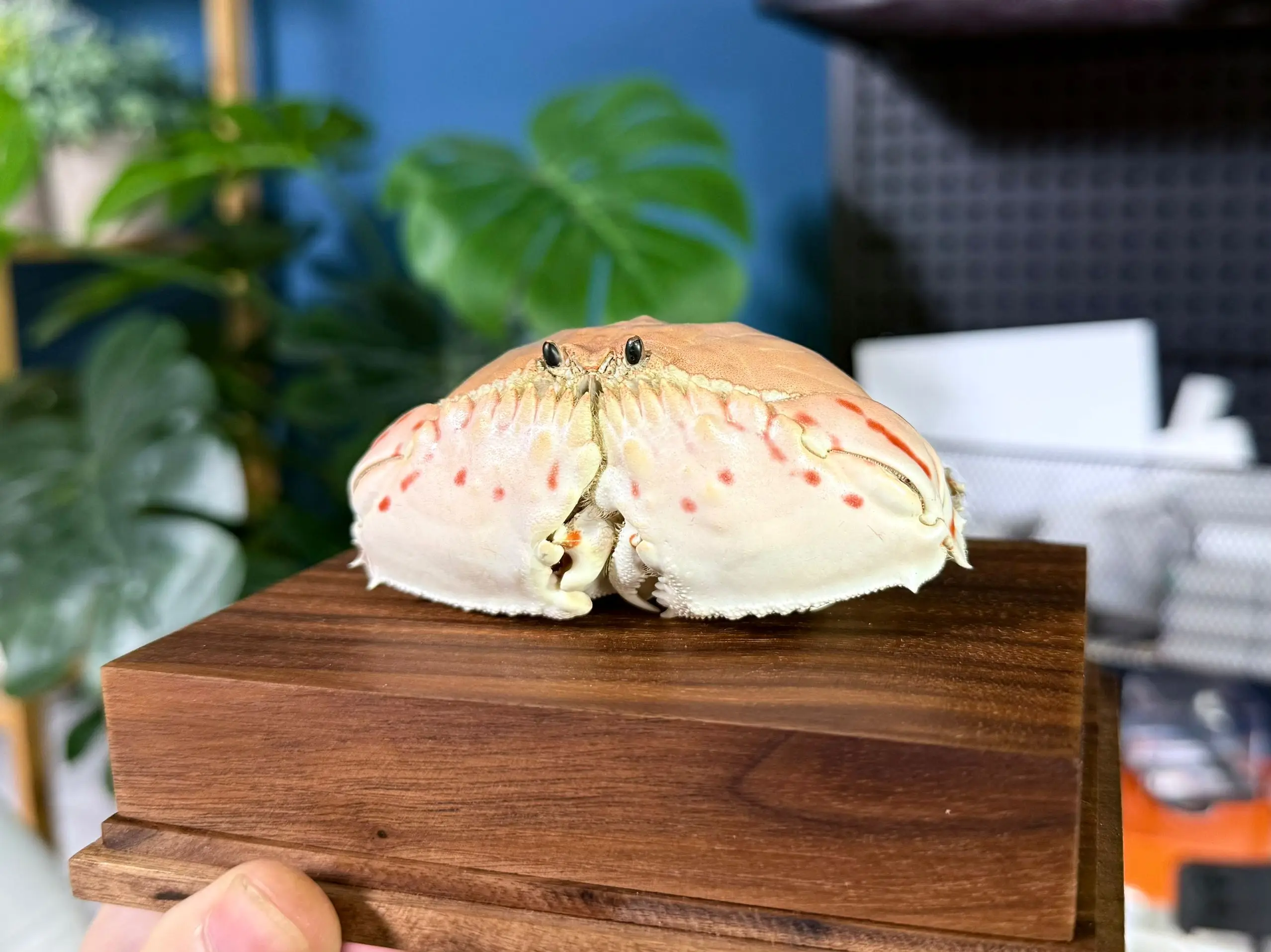 Skutečný krab vyčištěn, konzervován, sušen. Struktura krunýře ve tvaru kupole zachována. Poloha nohou nastavena během konzervace (nelze přenastavit). Přirozený vzor skvrn a barvy zachovány.