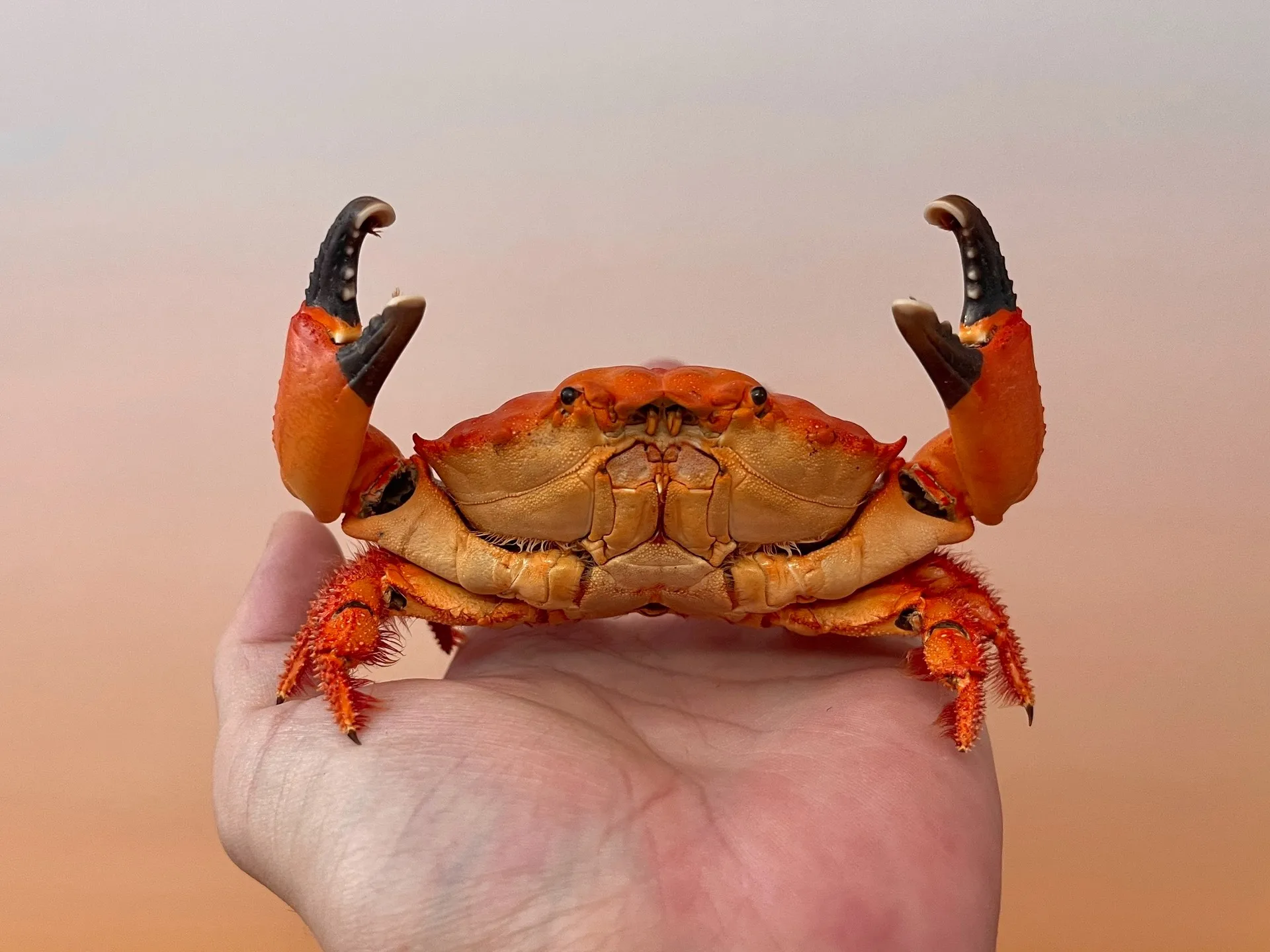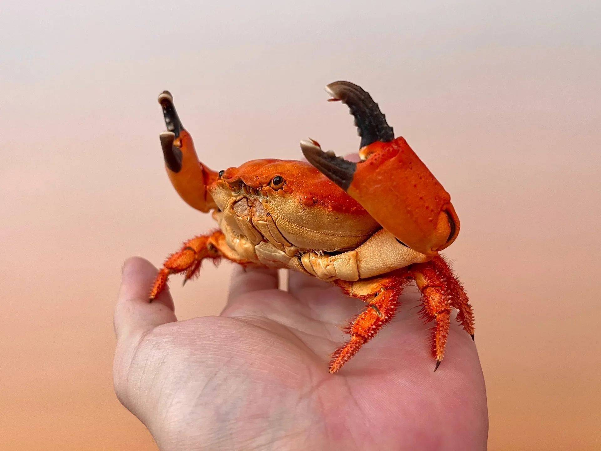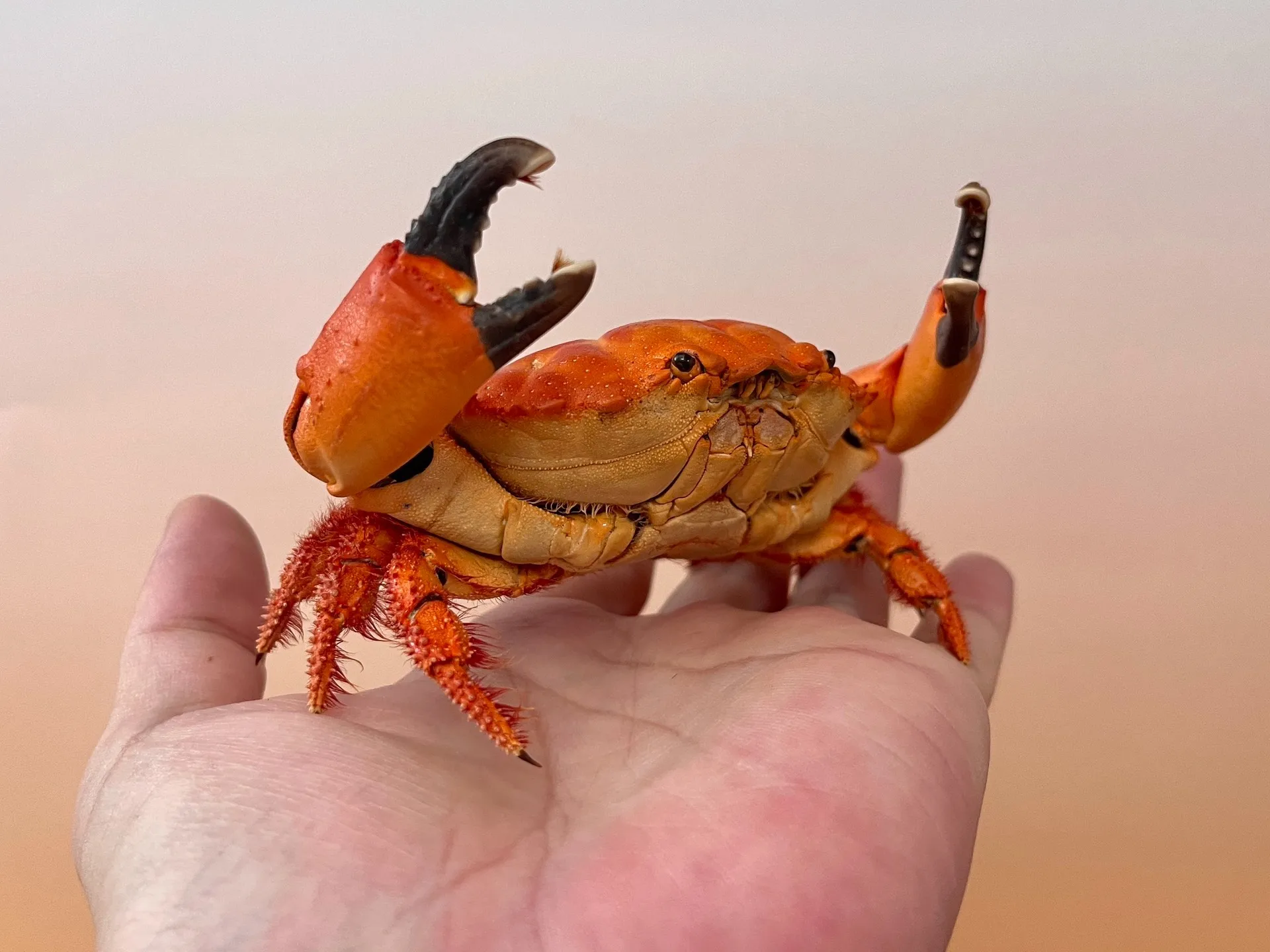 Teplé oranžové a korálové tóny vynikají na výstavách. Vytváří ohnisko díky jasnému zbarvení. Méně běžné než standardní hnědé nebo šedé exempláře krabů.