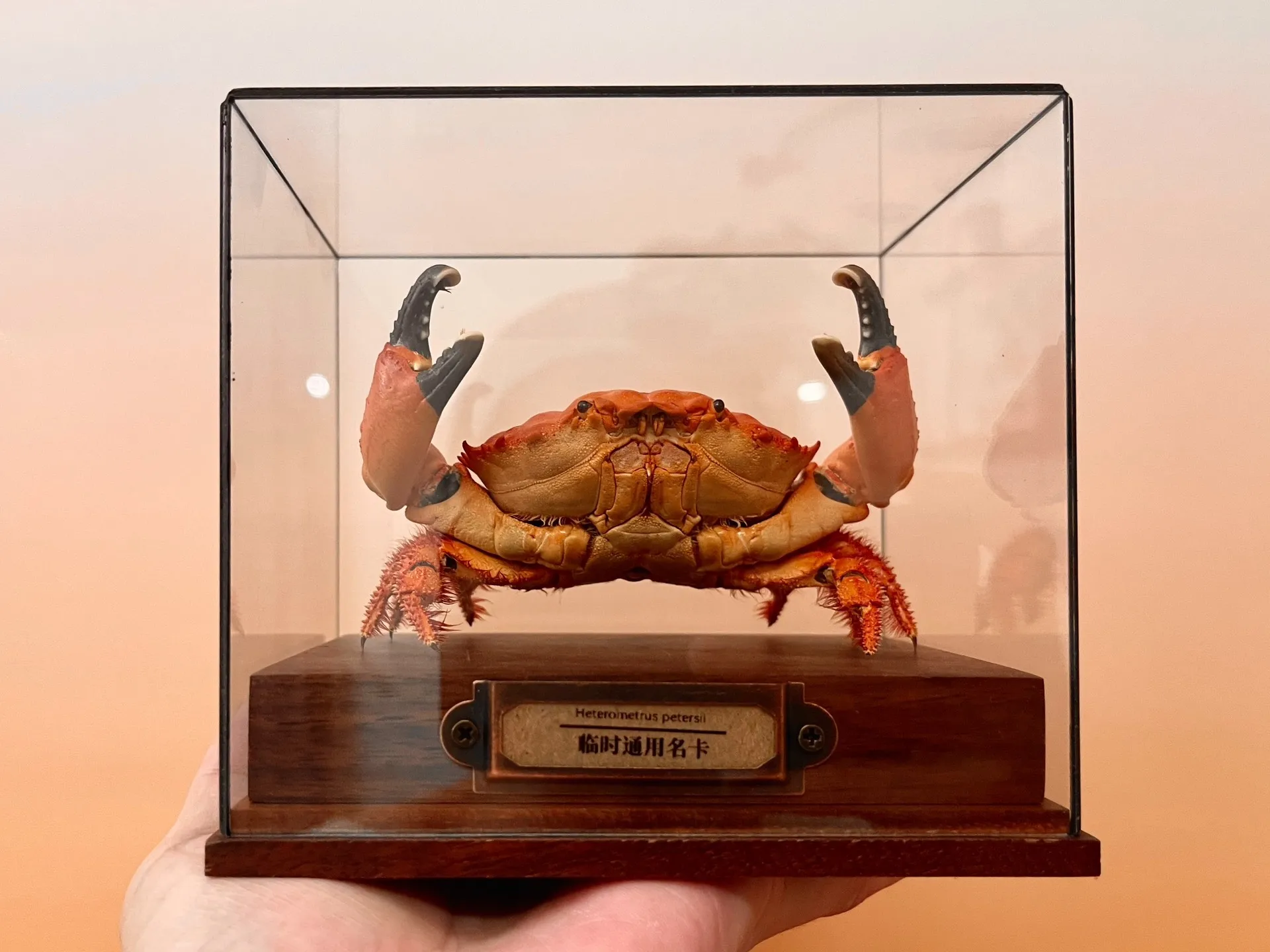 Jasné teplé zbarvení je méně běžné než standardní hnědé nebo šedé exempláře krabů. Barevná živost zvyšuje zájem sběratelů a hodnotu výstavy.