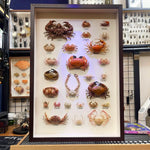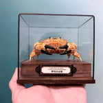 Skutečný krab vyčištěn, konzervován a usušen pro trvalé vystavení. Rysy krunýře a úhlové charakteristiky zachovány. Umístěn tak, aby ukázal výrazné hřebeny a okraje.