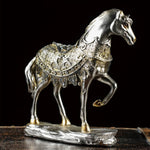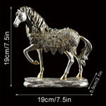 Figurka koně v chůzi s ozdobnou dekorativní dečkou na sedlo. Stříbrné kovové tělo s pozlacenými kopyty. Konstrukce z pryskyřice s detailně vyřezávanými květinovými nebo scrollovými vzory na krytu dečky. Integrovaná základna.