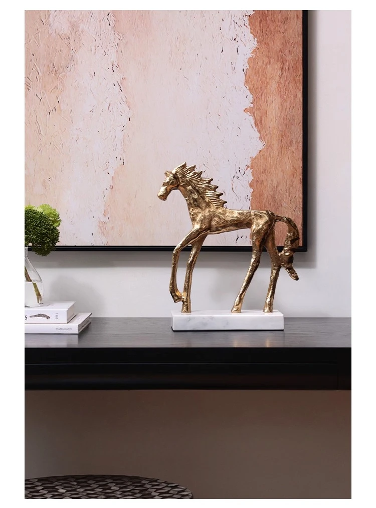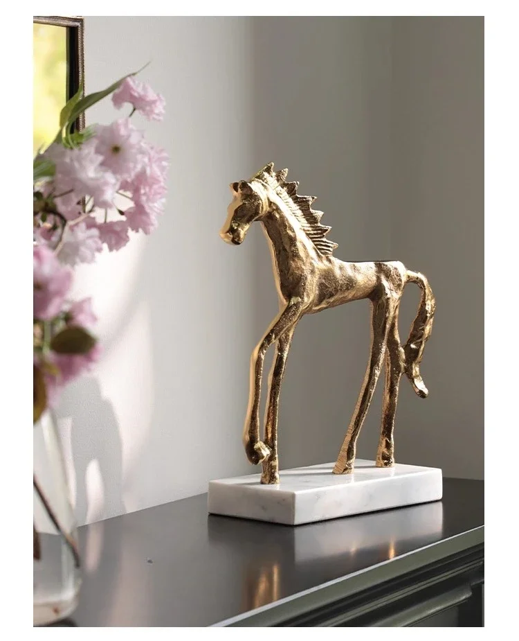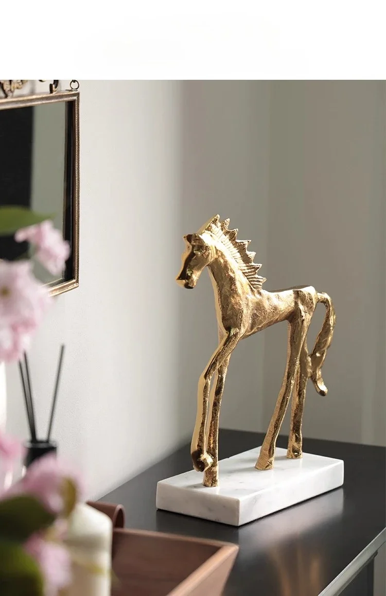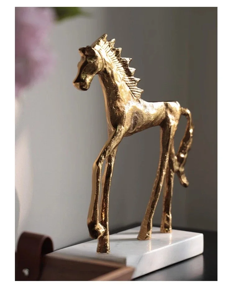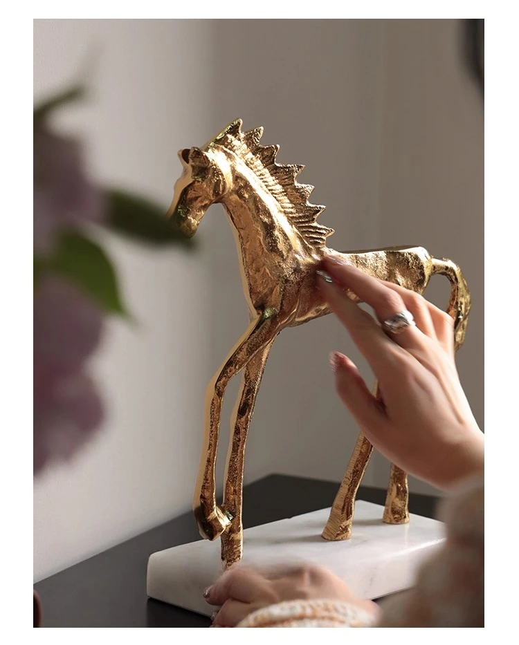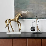 Socha zlatého koně v mid-century stylu na mramorovém podstavci