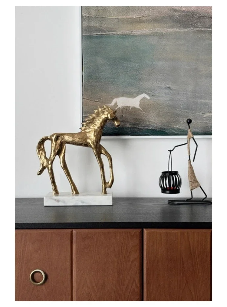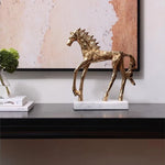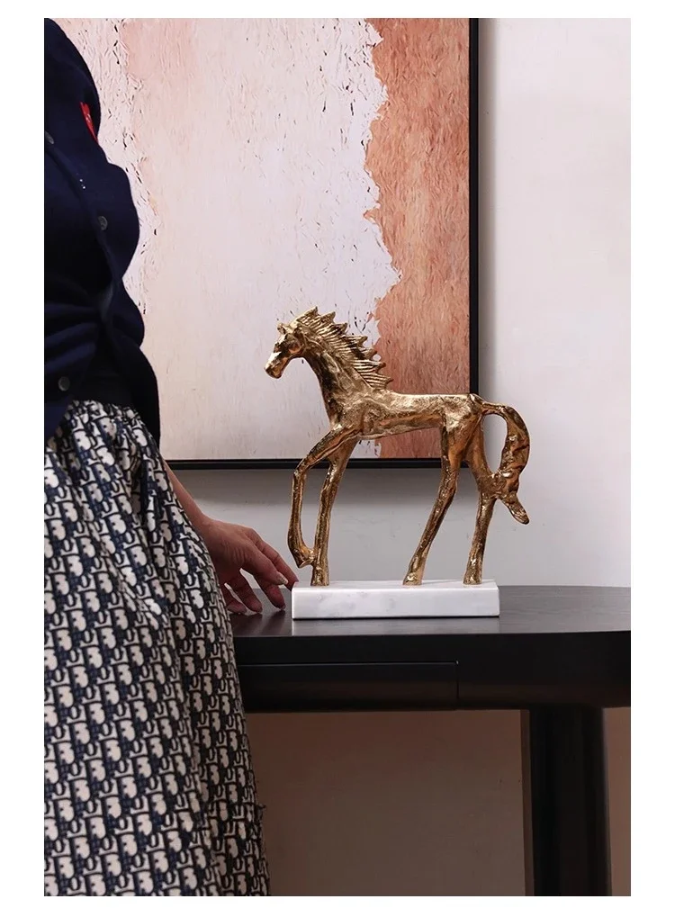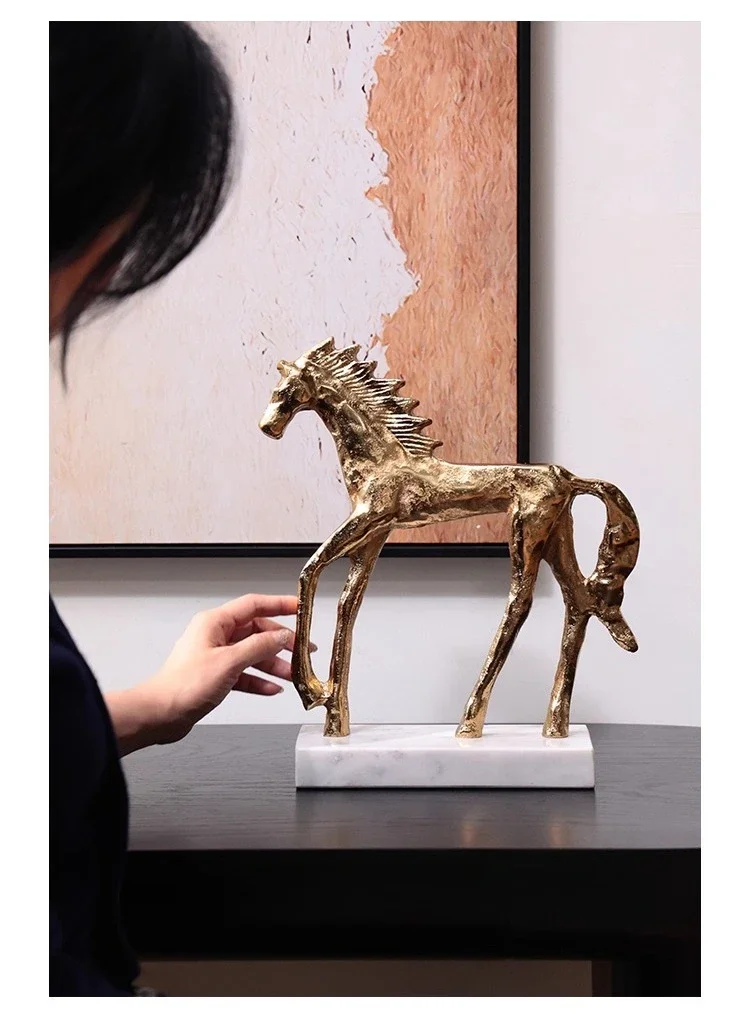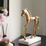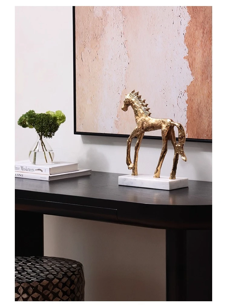 Socha zlatého koně v mid-century stylu na mramorovém podstavci