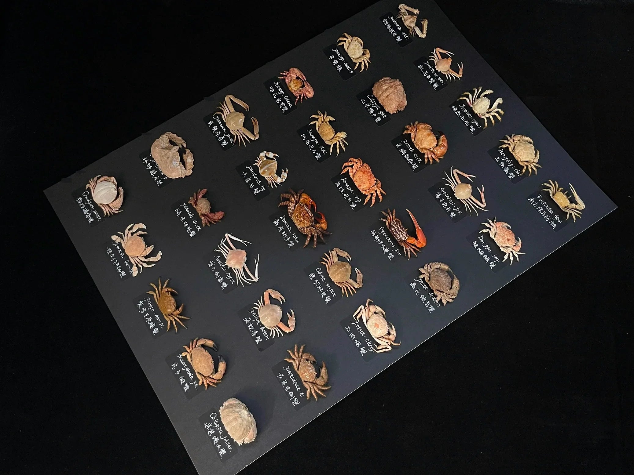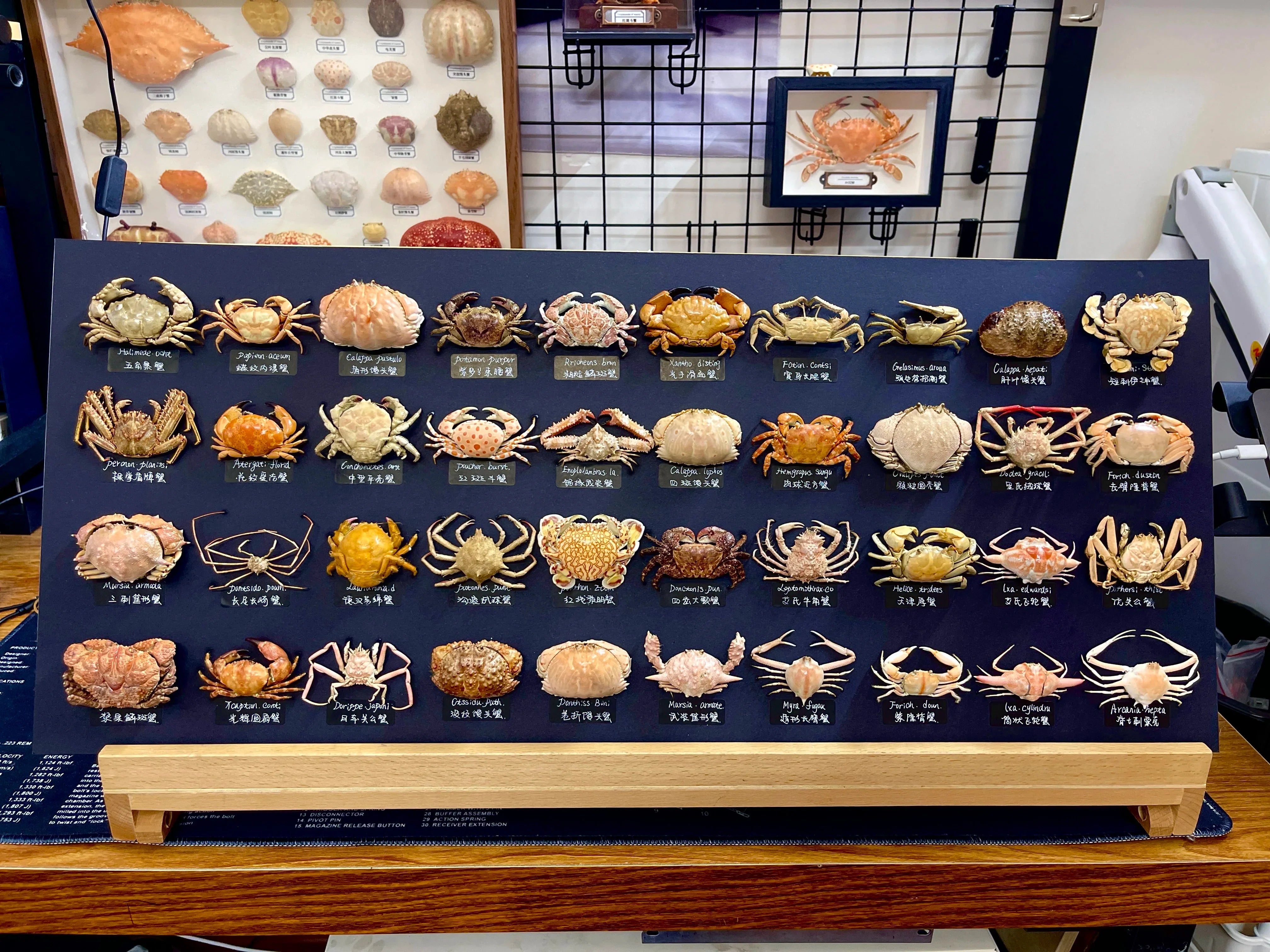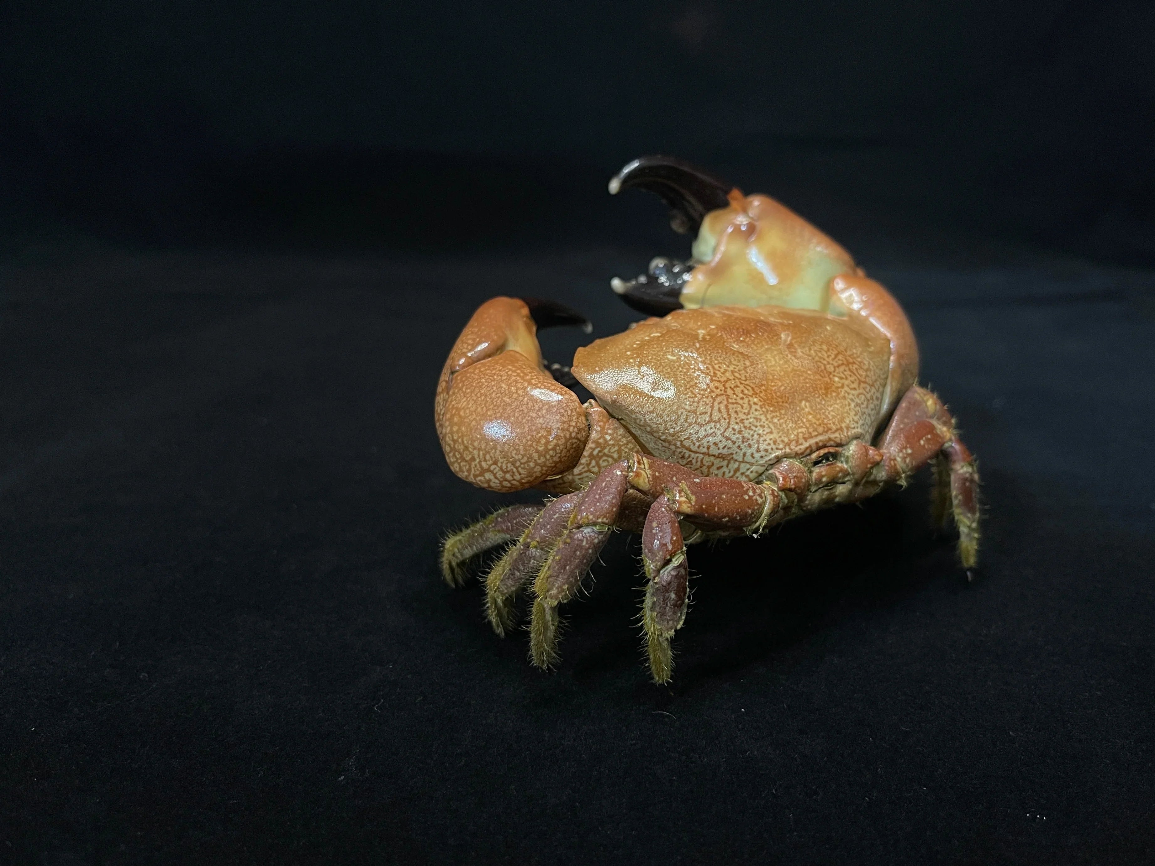 Skutečný krab je čištěn, konzervován a sušen pro trvalé vystavení. Skořápka a přívěsky jsou stabilizovány při zachování původní intenzity barev. Umístěn tak, aby ukázal charakteristickou velikost klepet.