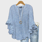 Vylepšete svůj klasický styl s tímto elegantním tričkem v modrých odstínech s bílými vertikálními pruhy. Jeho minimalistický design kombinuje eleganci s praktičností, zatímco volánkové rukávy přidávají ženskost a flexibilitu. Je ideální pro každodenní nošení, ale také pro formálnější příležitosti.