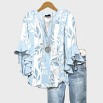 Osvěžte svůj letní styl s touto nádhernou modrou blůzou zdobenou elegantními bílými listy. Romantické detaily na rukávech s volány přidávají pohyb a ženskost, zatímco pohodlný střih zajišťuje snadnost a eleganci pro každý okamžik dne.