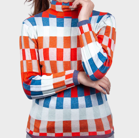 ERIKA – Pletený patchwork svetr s vysokým límcem