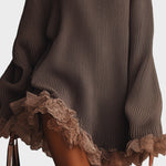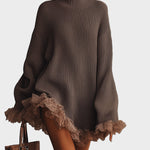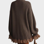 Ultra-měkké svetrové šaty s romantickým nádechem. Jejich oversized střih, elegantní vysoký límec a jemné volány na spodní části vytvářejí bez námahy chic vzhled — pohodlné, ženské a ideální na chladné dny, kdy chcete vypadat stylově, ale zároveň se cítit komfortně.